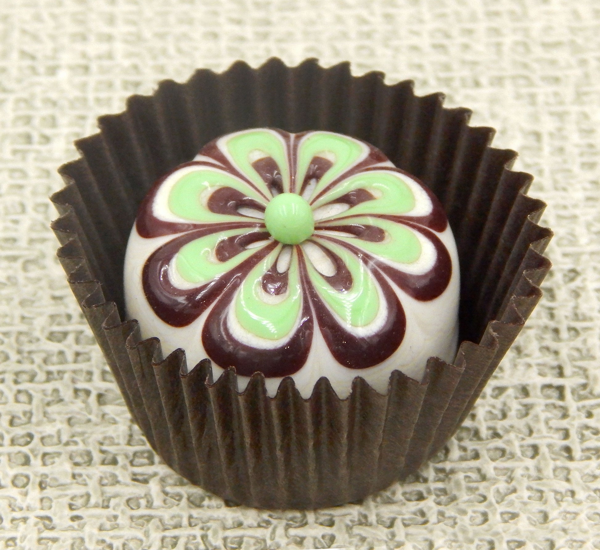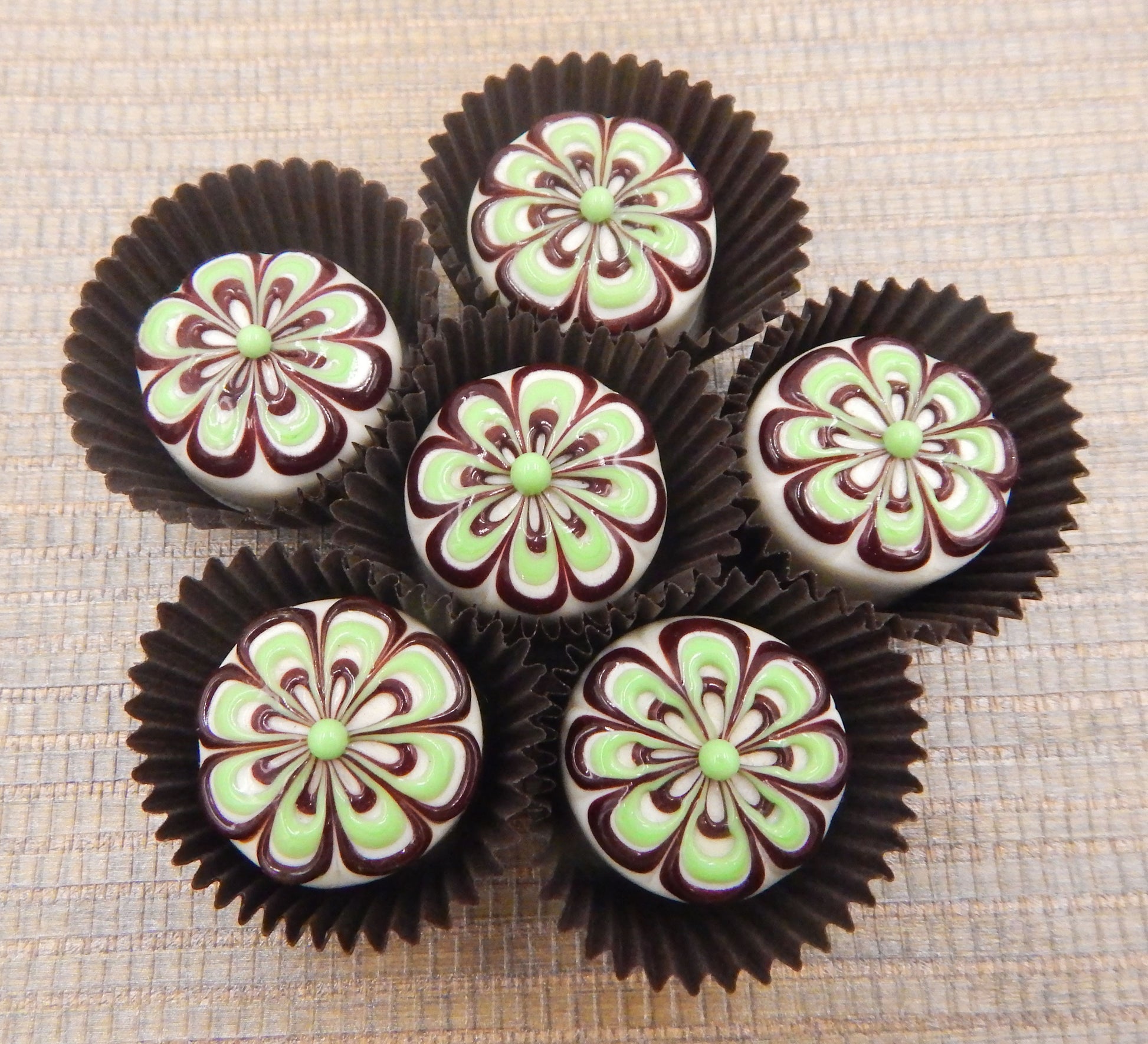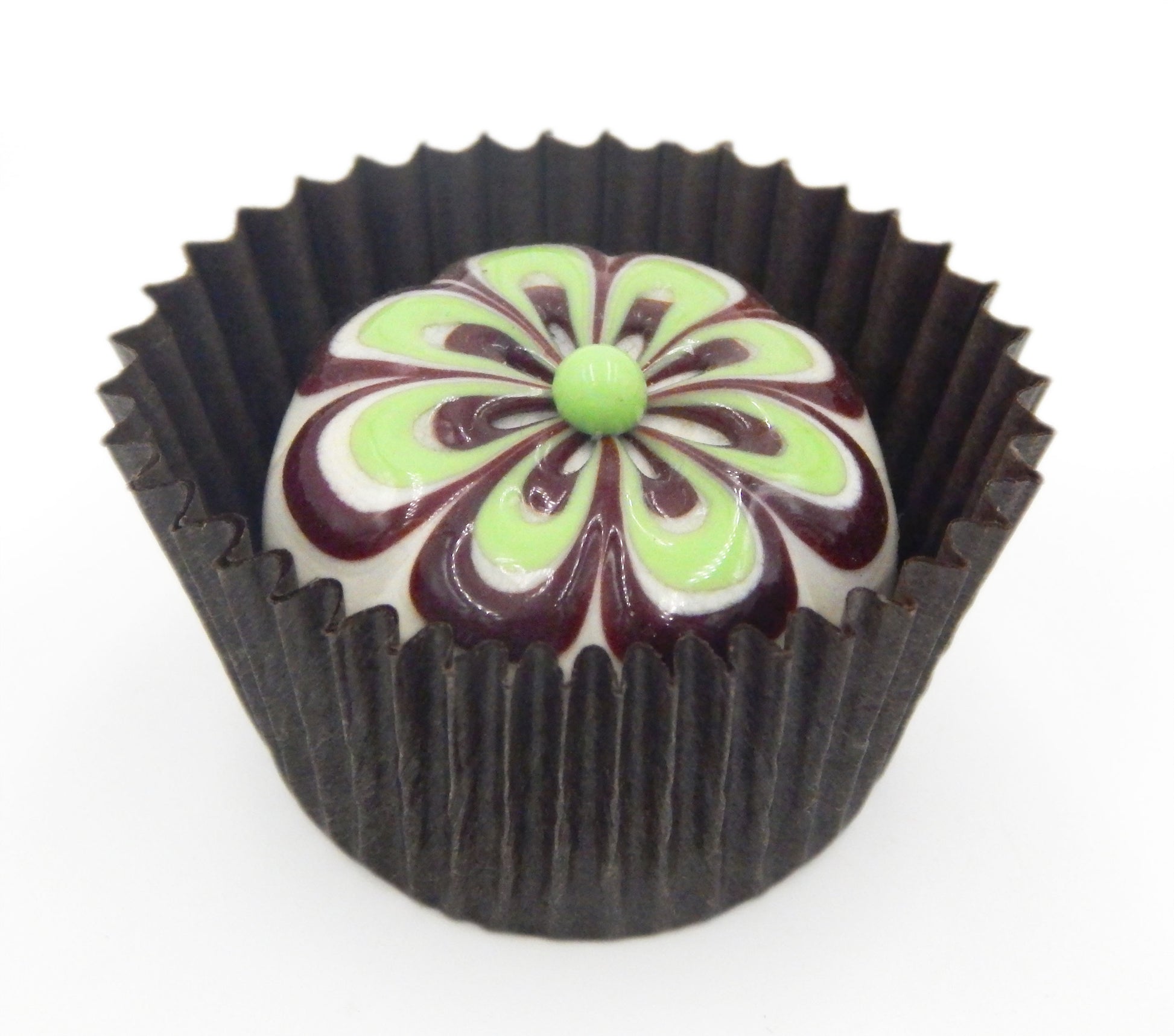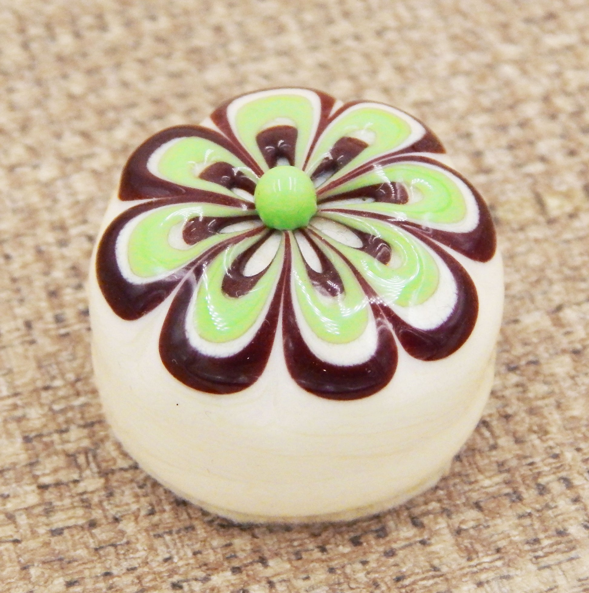 A handmade collectible solid glass vanilla chocolate with a scrumptious chocolate and mint green floral design on top created from colorful glass utilizing flameworking techniques. Meticulous attention to detail has gone into the construction of each of our pieces to enhance its appeal and collectibility.