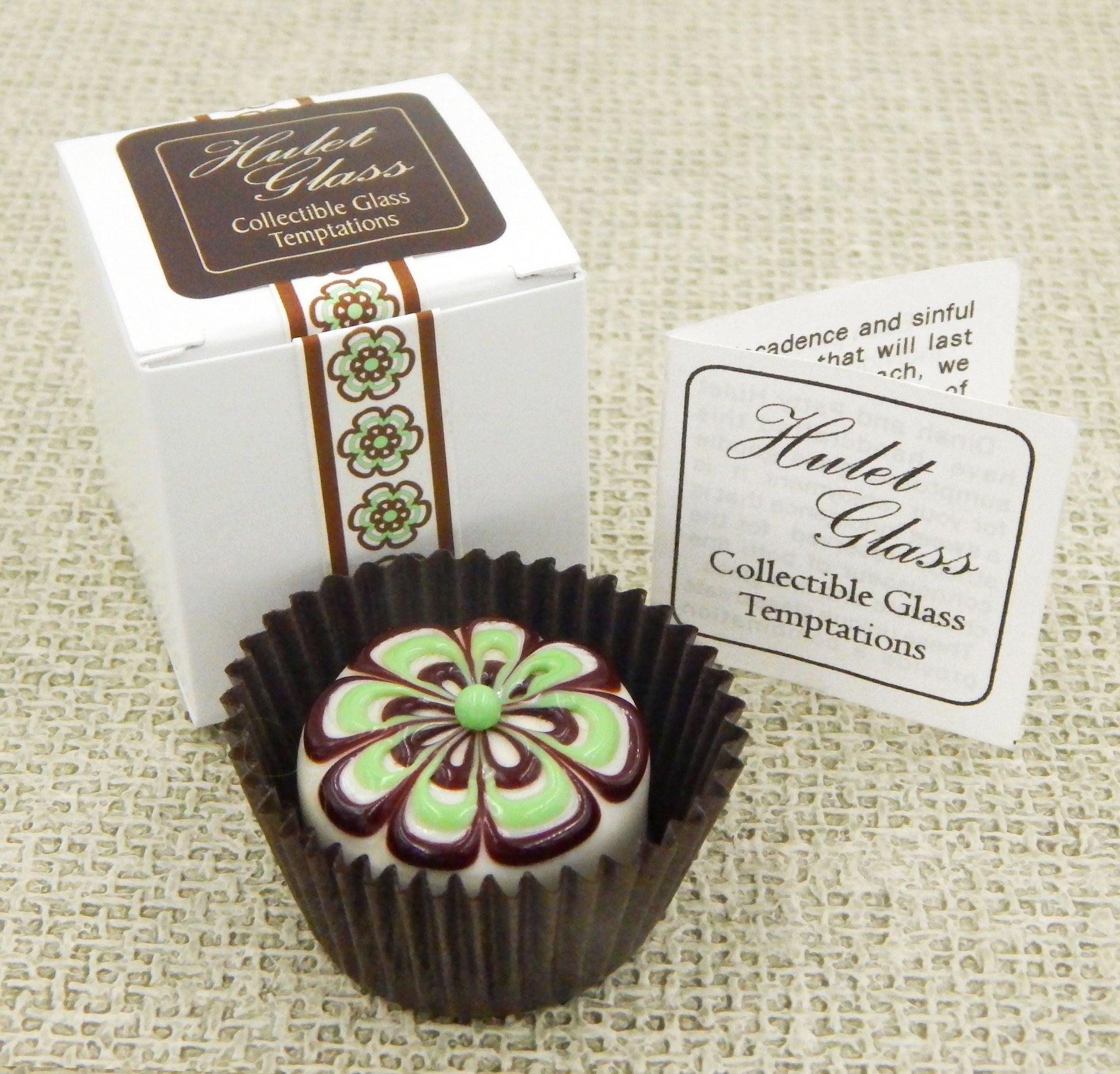 The glass chocolate measures approximately 1.25" x 1" (slightly larger than an actual chocolate candy) and sits in a fluted glassine paper candy cup. The bottom of the chocolate is covered in felt to protect the surface it will sit upon. Each beautiful glass chocolate is signed (Hulet), dated and comes to you in a colorful gift box with an enclosure card telling a bit about the piece.