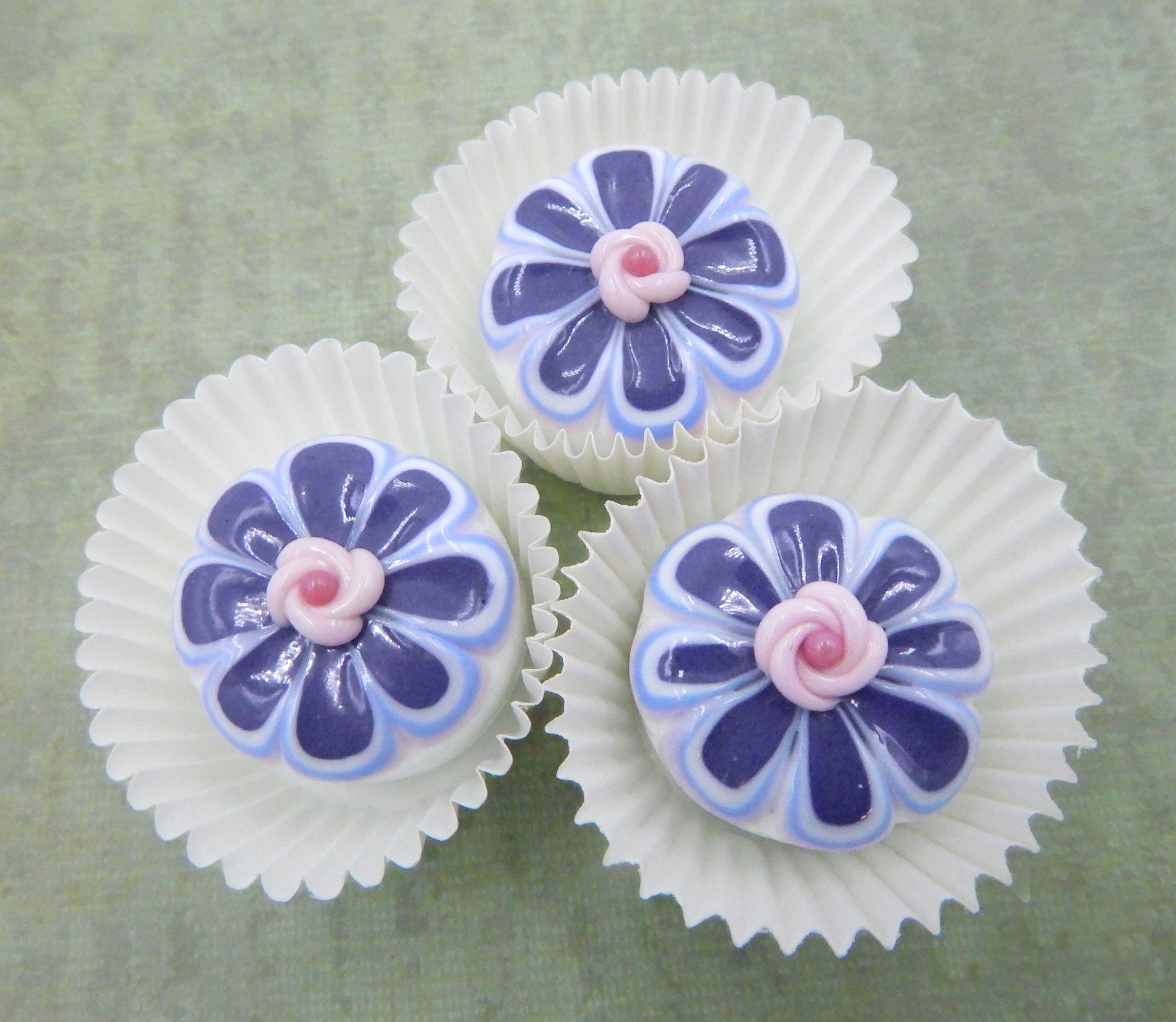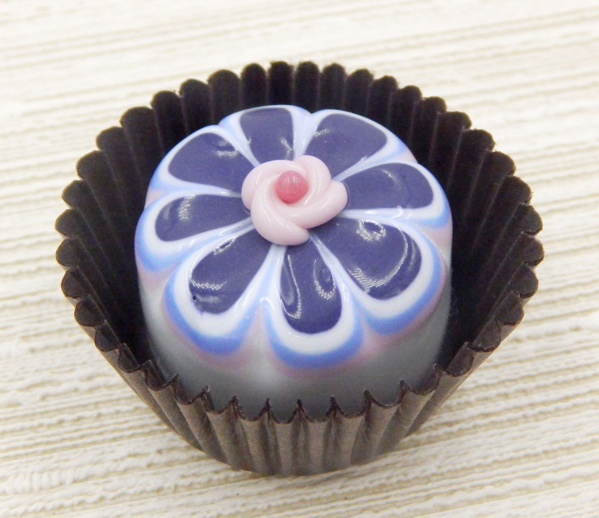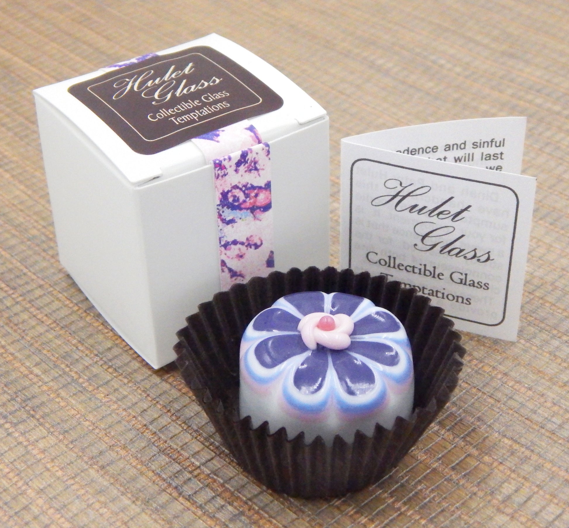 The glass chocolate measures approximately 1.25" x 1" (slightly larger than an actual chocolate candy) and sits in a fluted glassine paper candy cup. The bottom of the chocolate is covered in felt to protect the surface it will sit upon. Each beautiful glass chocolate is signed (Hulet), dated and comes to you in a colorful gift box with an enclosure card telling a bit about the piece.