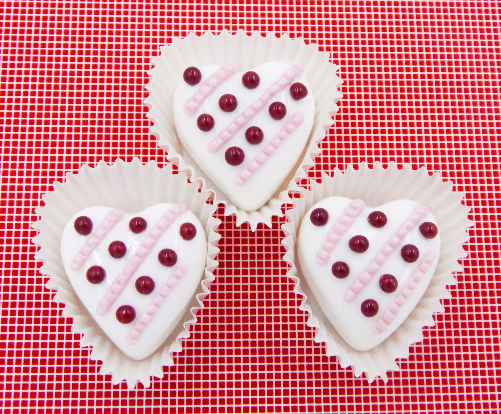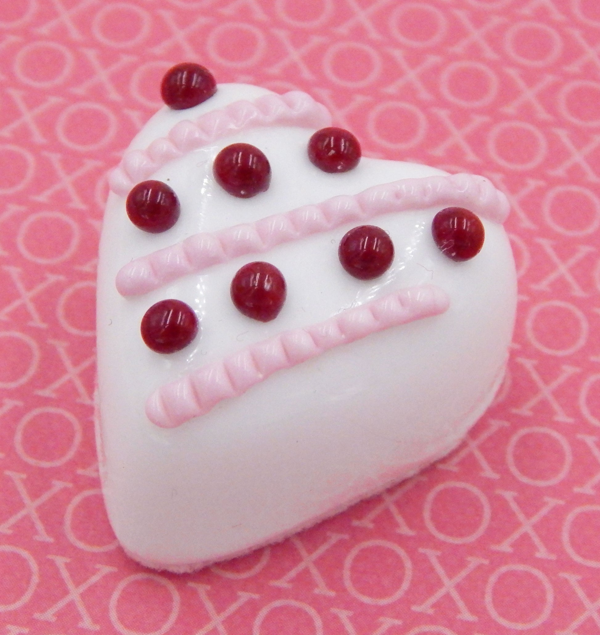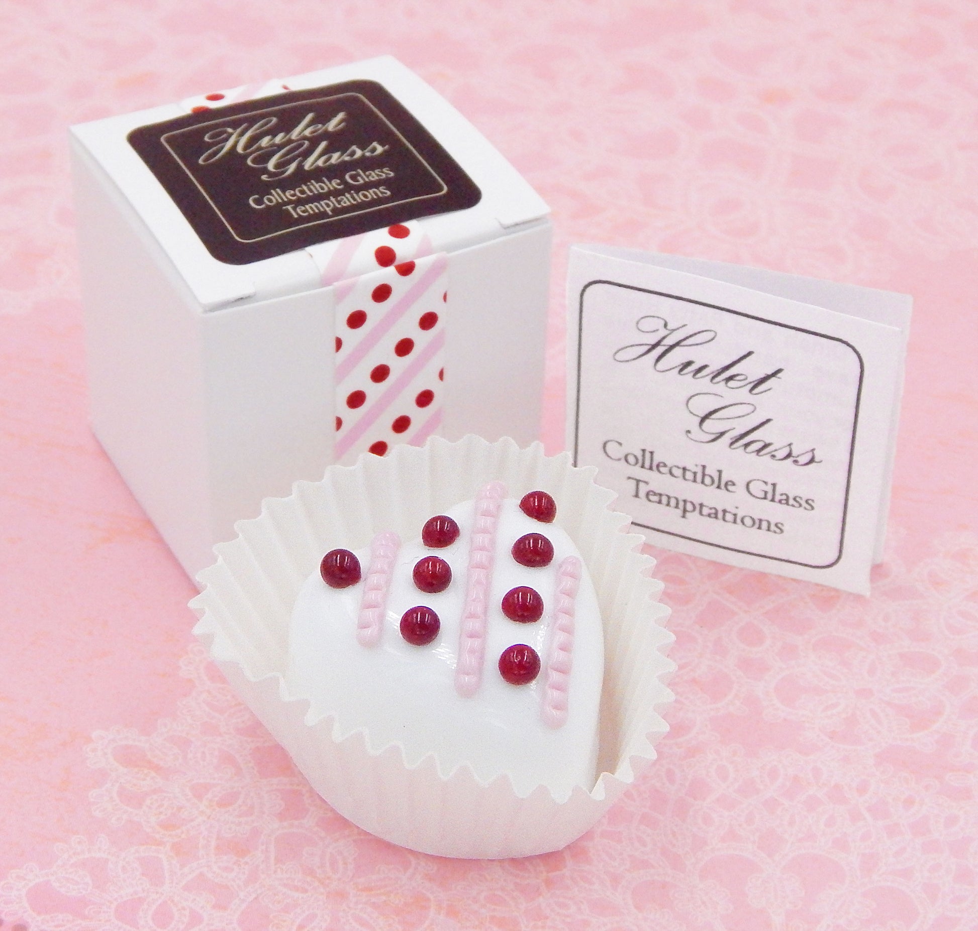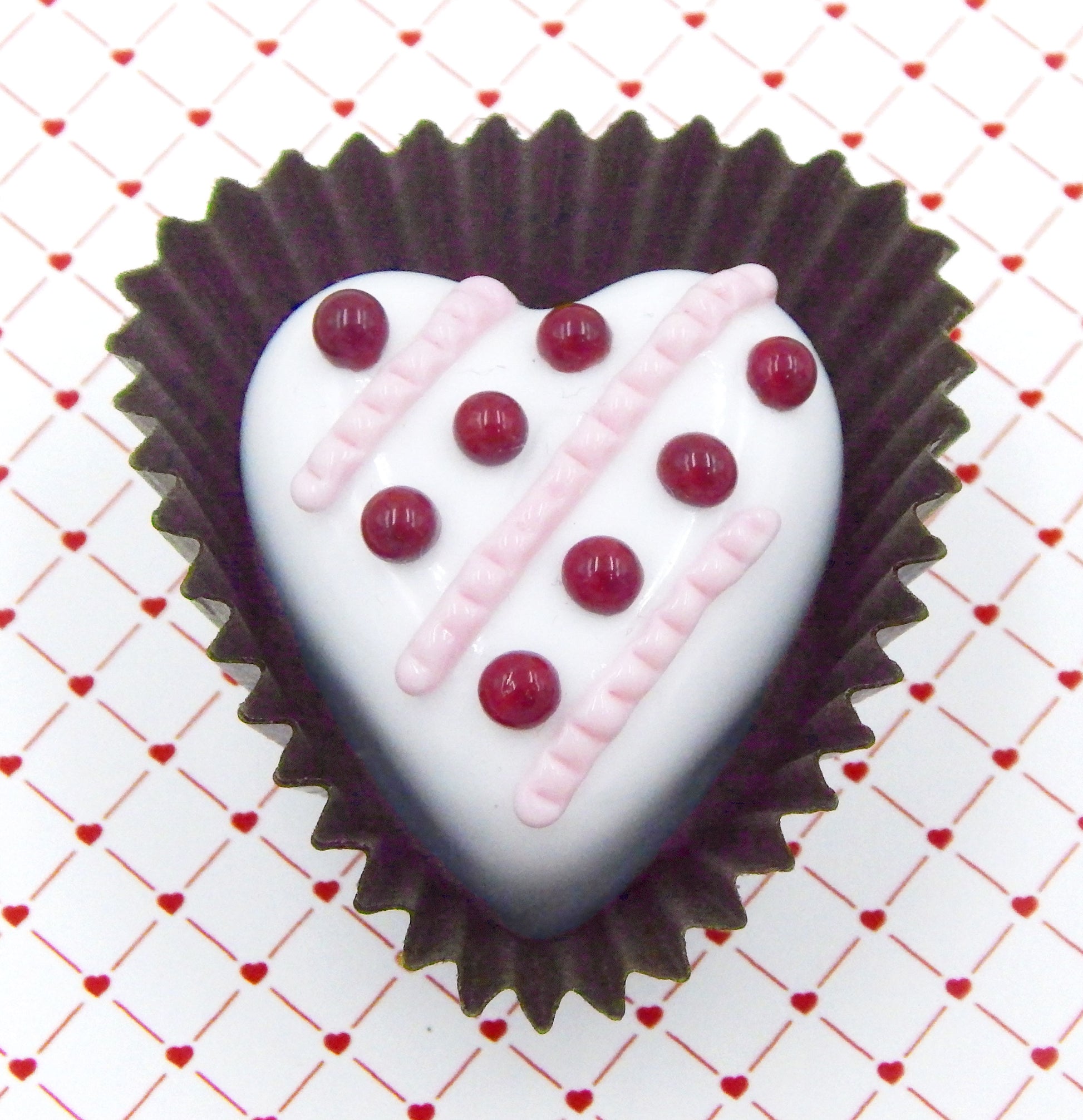 A handmade collectible solid glass heart-shaped white chocolate with strawberry lines and cherry dots on top created from colorful glass utilizing flameworking techniques. Meticulous attention to detail has gone into the construction of each of our pieces to enhance its appeal and collectibility.