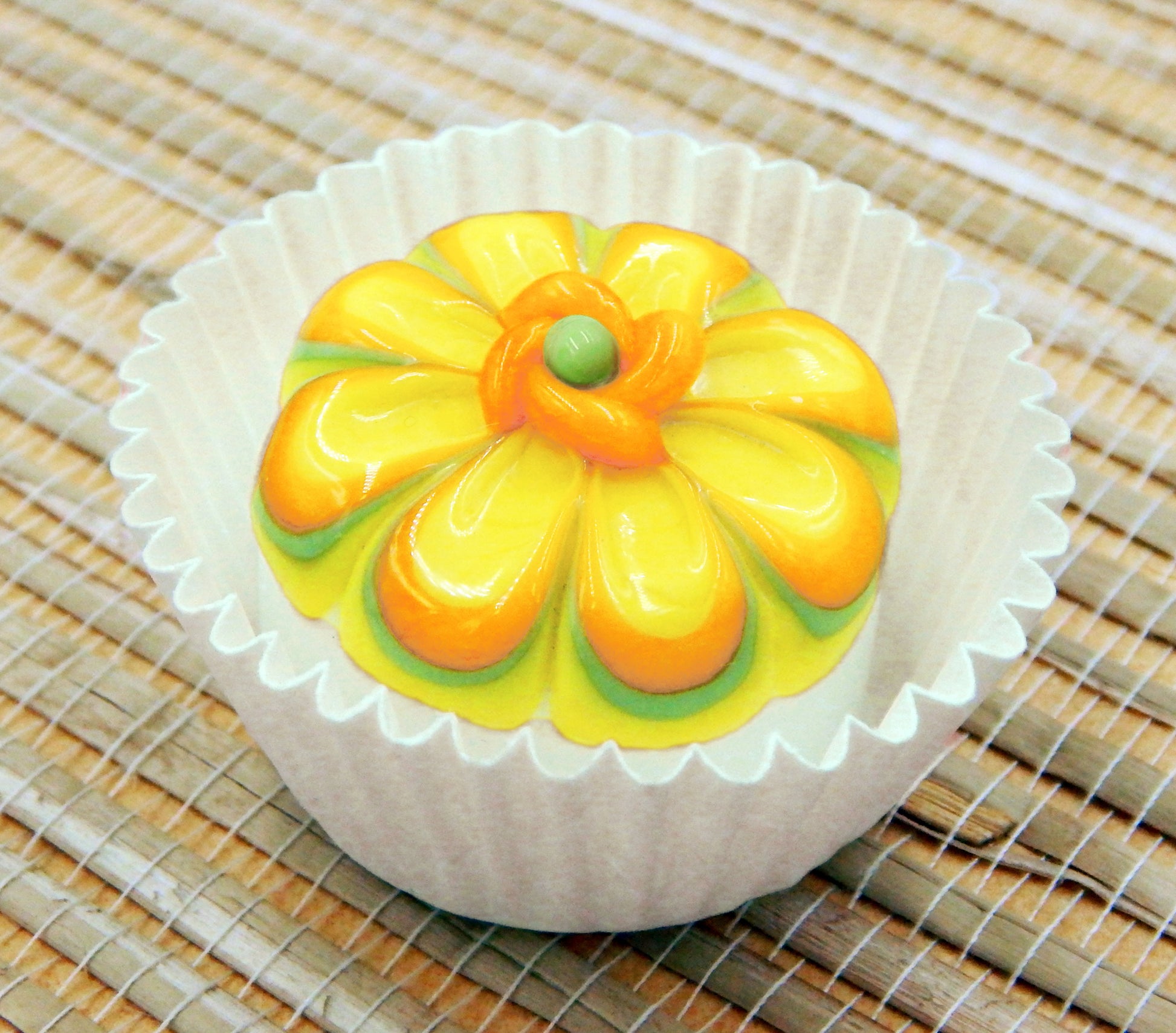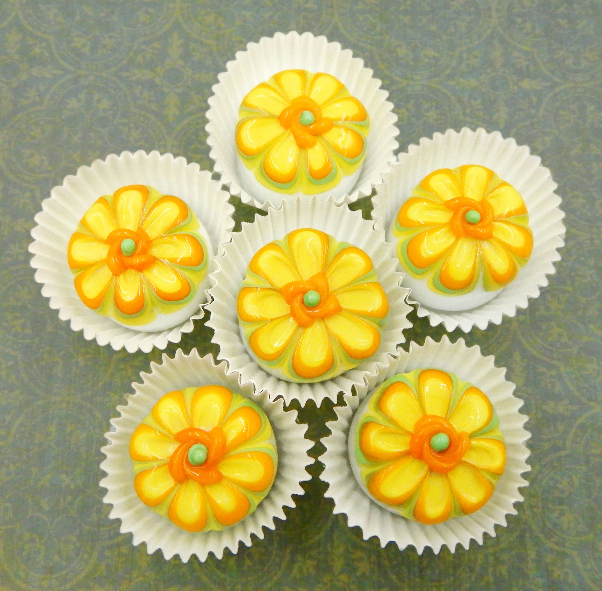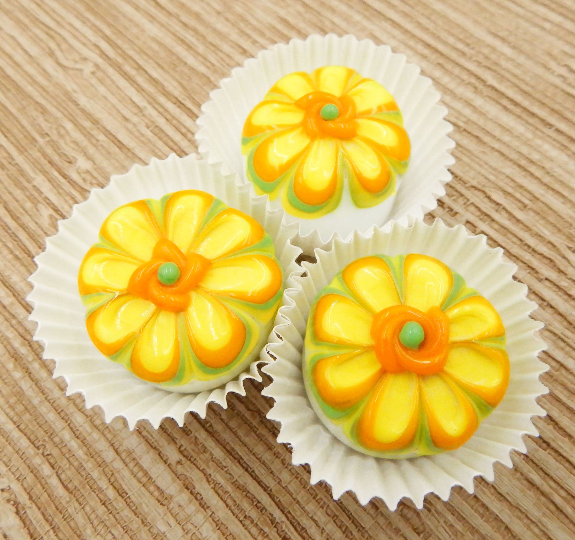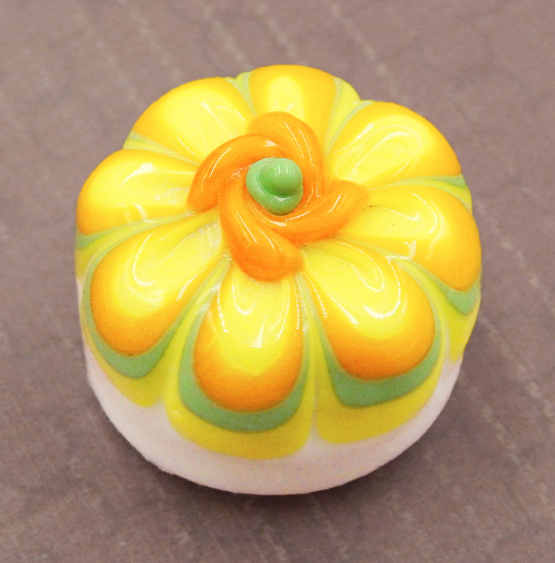 A handmade collectible solid glass white chocolate with a cosmos design of lemon and mango created from colorful glass utilizing flameworking techniques. Meticulous attention to detail has gone into the construction of each of our pieces to enhance its appeal and collectibility.