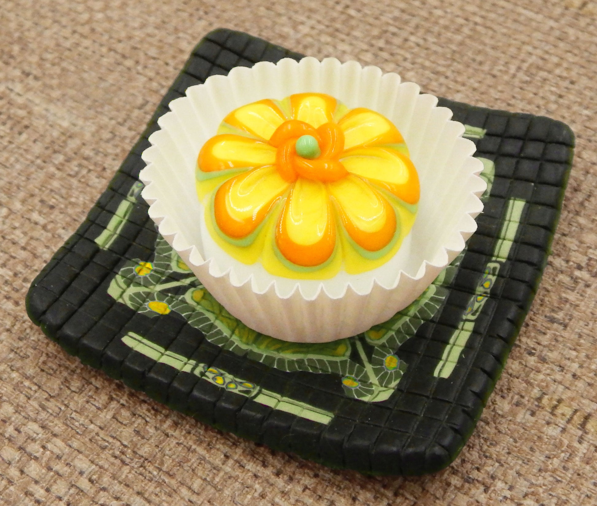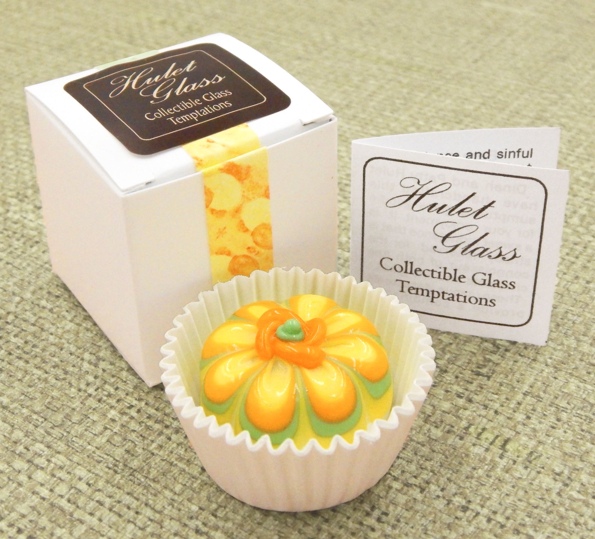 The glass chocolate measures 1.25" x 1" (slightly larger than an actual chocolate candy) and sits in a fluted glassine paper candy cup. The bottom of the chocolate is covered in felt to protect the surface it will sit upon. Each beautiful glass chocolate is signed (Hulet), dated and comes to you in a colorful gift box with an enclosure card telling a bit about the piece.