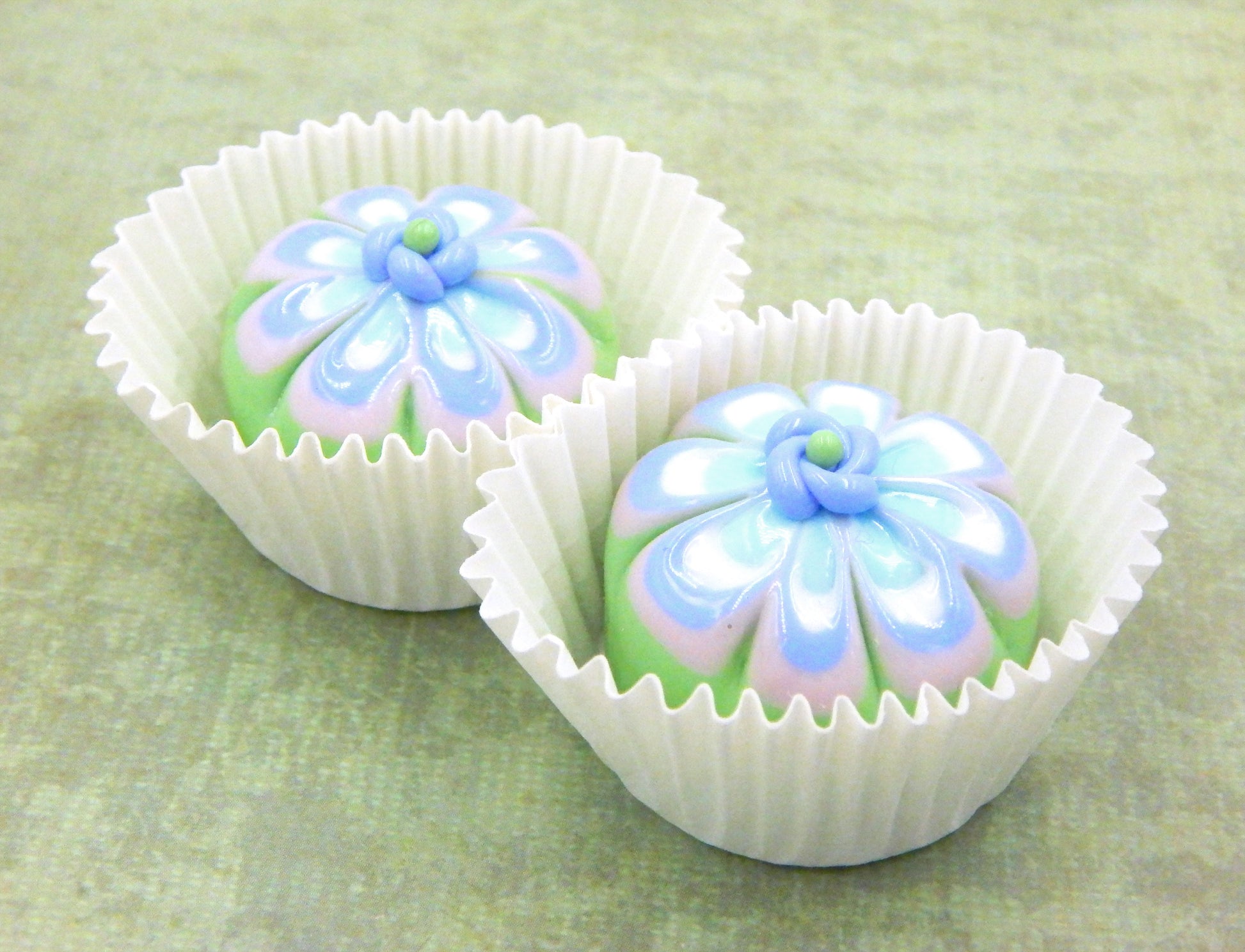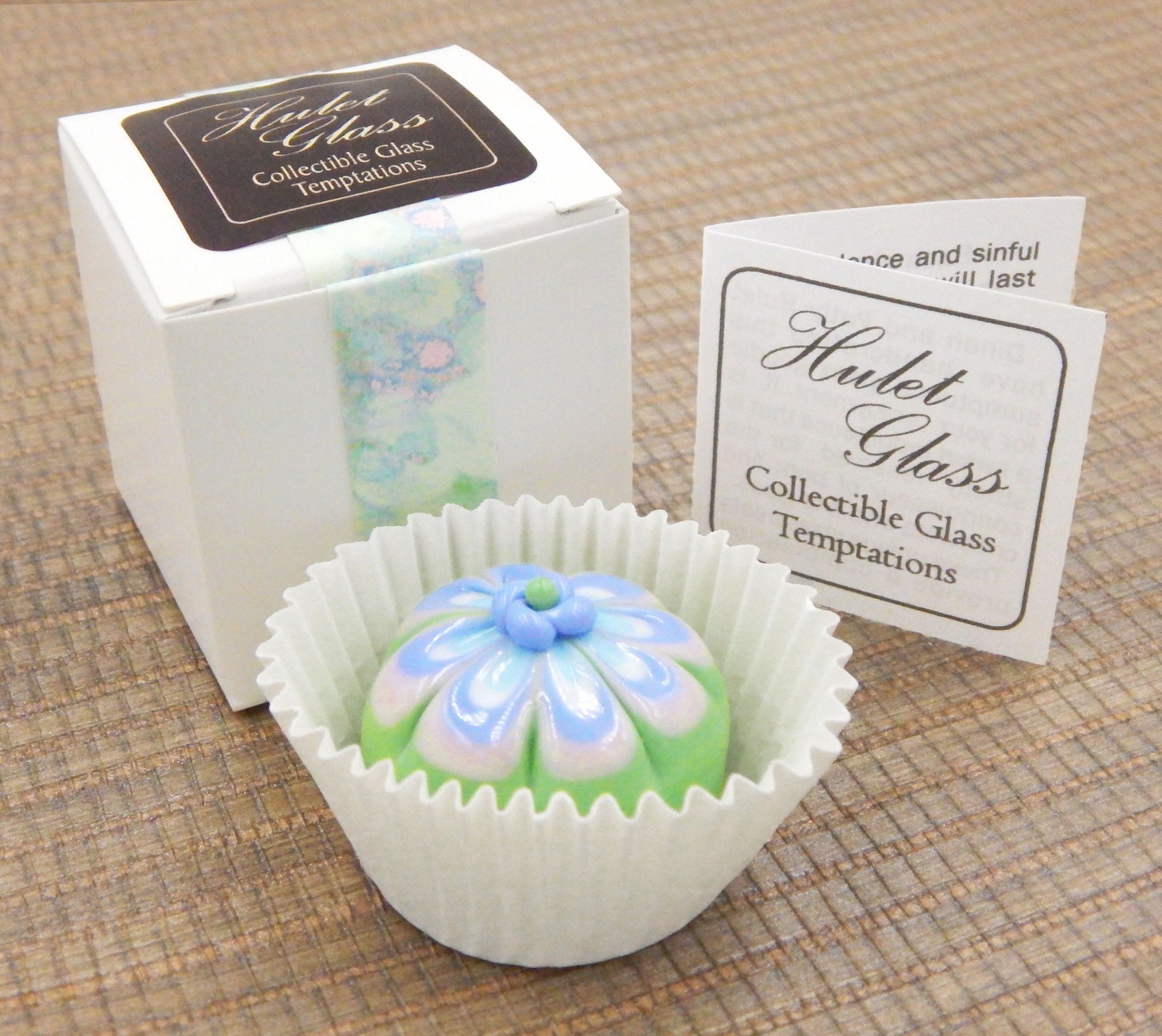 The glass chocolate measures approximately 1.25" x 1" (slightly larger than an actual chocolate candy) and sits in a fluted glassine paper candy cup. The bottom of the chocolate is covered in felt to protect the surface it will sit upon. Each beautiful glass chocolate is signed (Hulet), dated and comes to you in a colorful gift box with an enclosure card telling a bit about the piece.