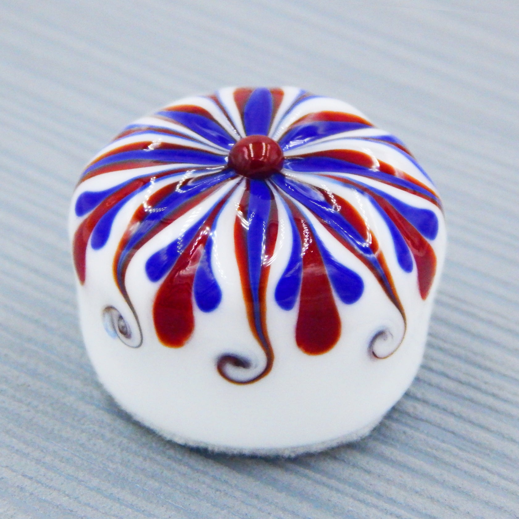A handmade collectible solid glass chocolate with patriotic red, white and blue embellishment created from colorful glass utilizing flameworking techniques. Meticulous attention to detail has gone into the construction of each of our pieces to enhance its appeal and collectibility.