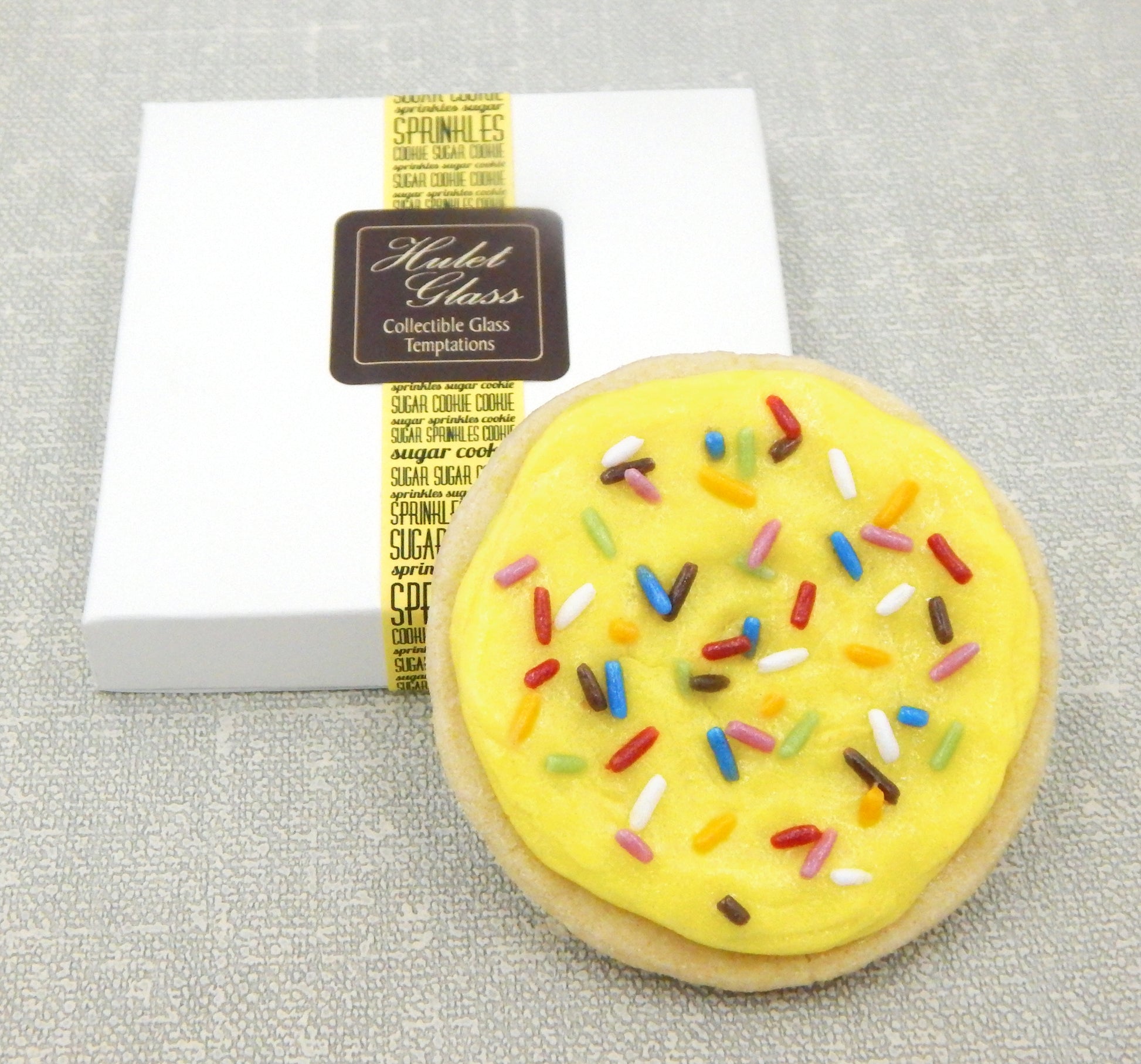 A handmade collectible solid glass yellow sugar cookie with sprinkles crafted from colorful glass utilizing ancient pate de verre and flameworking techniques. Meticulous attention to detail has gone into the construction of each of our pieces to enhance its appeal and collectibility.